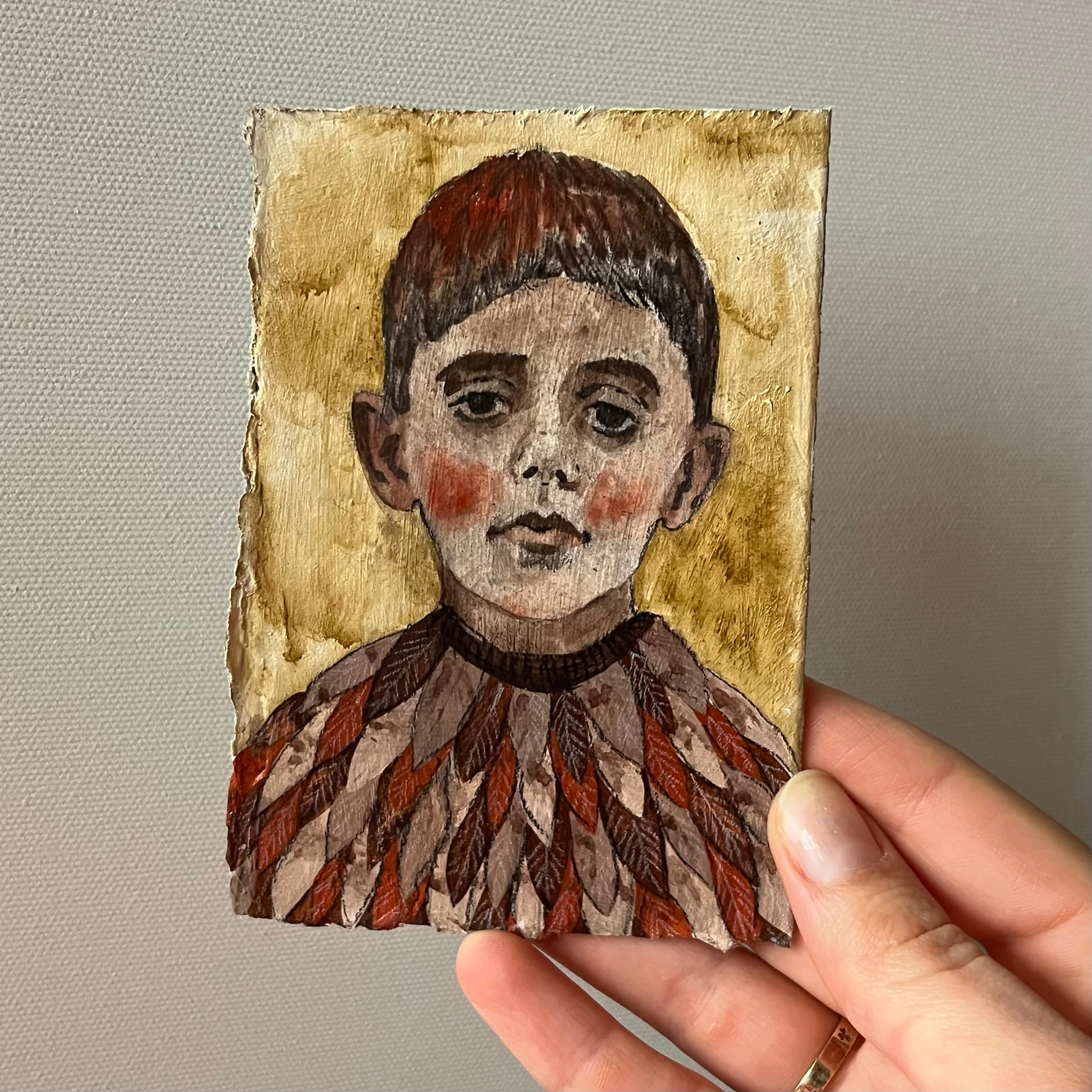 'Pierzasty Chłopiec', węgiel, gwasz, laserunek akrylowy zagruntowanym kartonie.