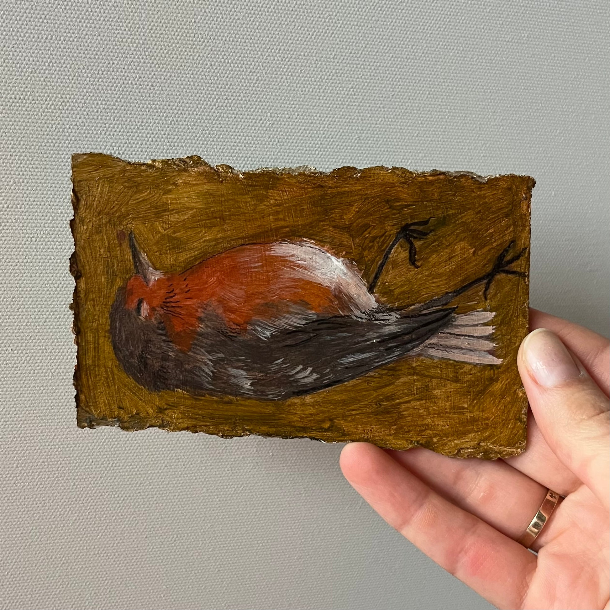 'Śpiący Rudzik', węgiel, gwasz, laserunek akrylowy zagruntowanym kartonie.